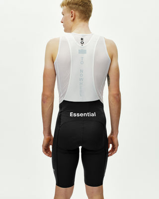The bibs have a tight fit, shaped by the breathable stretch-woven fabric and signature Essential Light structure. The fabric gives a closer feel than our main Essential Bibs, while remaining less compressive than the Mechanism Bibs. Laser-cut hems create a clean finish at the leg, and the soft, durable straps ensure a secure fit throughout the ride.